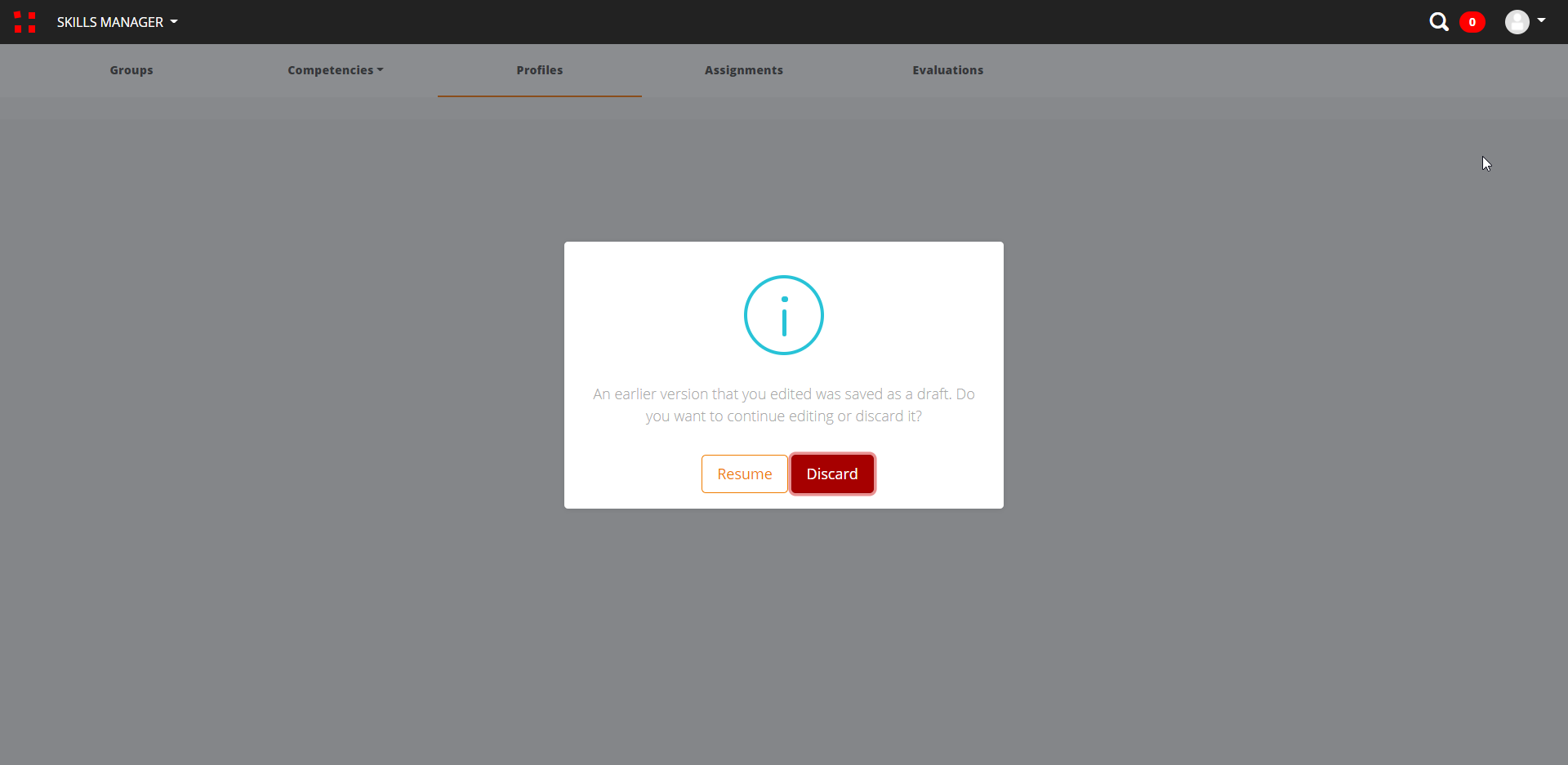 Wenn Sie mit der Erstellung einer Kompetenz oder eines Stellenprofils beginnen und das Formular verlassen, ohne zu speichern, z. B. indem Sie zu einer anderen Seite navigieren, werden Sie bei der Rückkehr und dem erneuten Öffnen des Erstellungsformulars gefragt, ob Sie mit dem vorherigen Formular fortfahren oder von vorne beginnen möchten. Dies gibt Ihnen die Möglichkeit, die eingegebenen Daten zurückzuverfolgen, wenn Sie das Formular versehentlich verlassen haben.