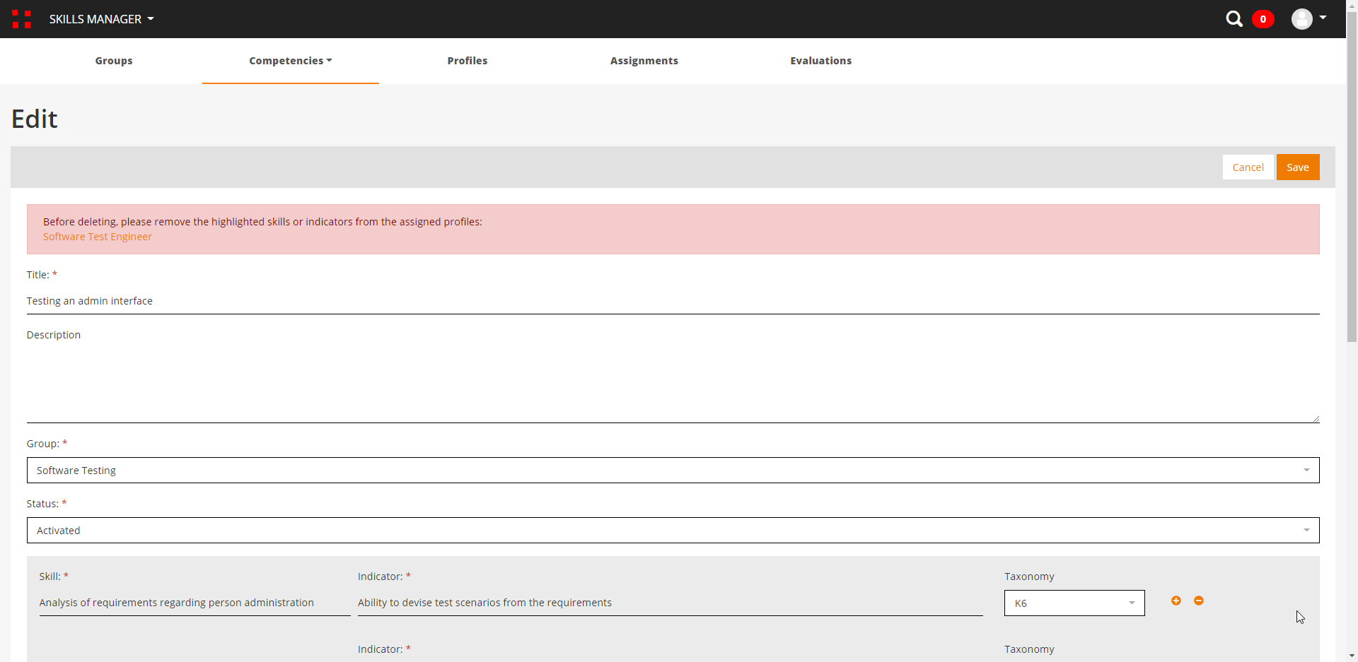 Sie können einen Skill/Indikator nur dann aus einer Kompetenz entfernen, wenn er in keinem Jobprofil verwendet wird. Aber keine Sorge, sollten Sie versuchen, diese Aktion durchzuführen, ohne zu wissen, ob er verwendet wird oder nicht, wird eine Fehlermeldung Sie daran hindern, dies zu tun. Sie können direkt zu den betroffenen Profilen navigieren und den Skill/Indikator von dort aus deaktivieren - sobald keine Verbindungen mehr bestehen, ist die Löschung während der Bearbeitung möglich.
