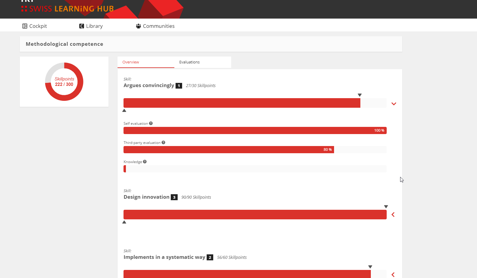 Der Skills Manager ermöglicht einem Lernenden, seinen Lernfortschritt anhand der Kompetenzen, Fähigkeiten und Indikatoren zu verfolgen, die in einem Job relevant sind. Dies erfolgt sowohl durch die Bearbeitung von Kursen (webbasierte Trainings) als auch durch Bewertungen von Beratern und Selbstreflexion.