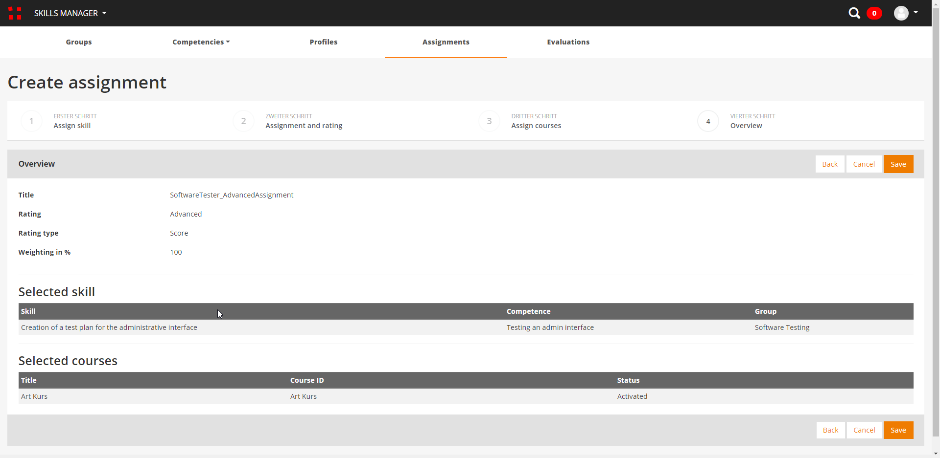 Übersicht über die bisherige Auswahl. Sie können die Zuordnung nun speichern oder Korrekturen vornehmen, indem Sie durch die abgeschlossenen Schritte zurückgehen. Wenn alles in Ordnung ist, können Sie auf Speichern klicken. Sie haben eine neue Zuordnung von einem Skill zu Kursen erstellt.