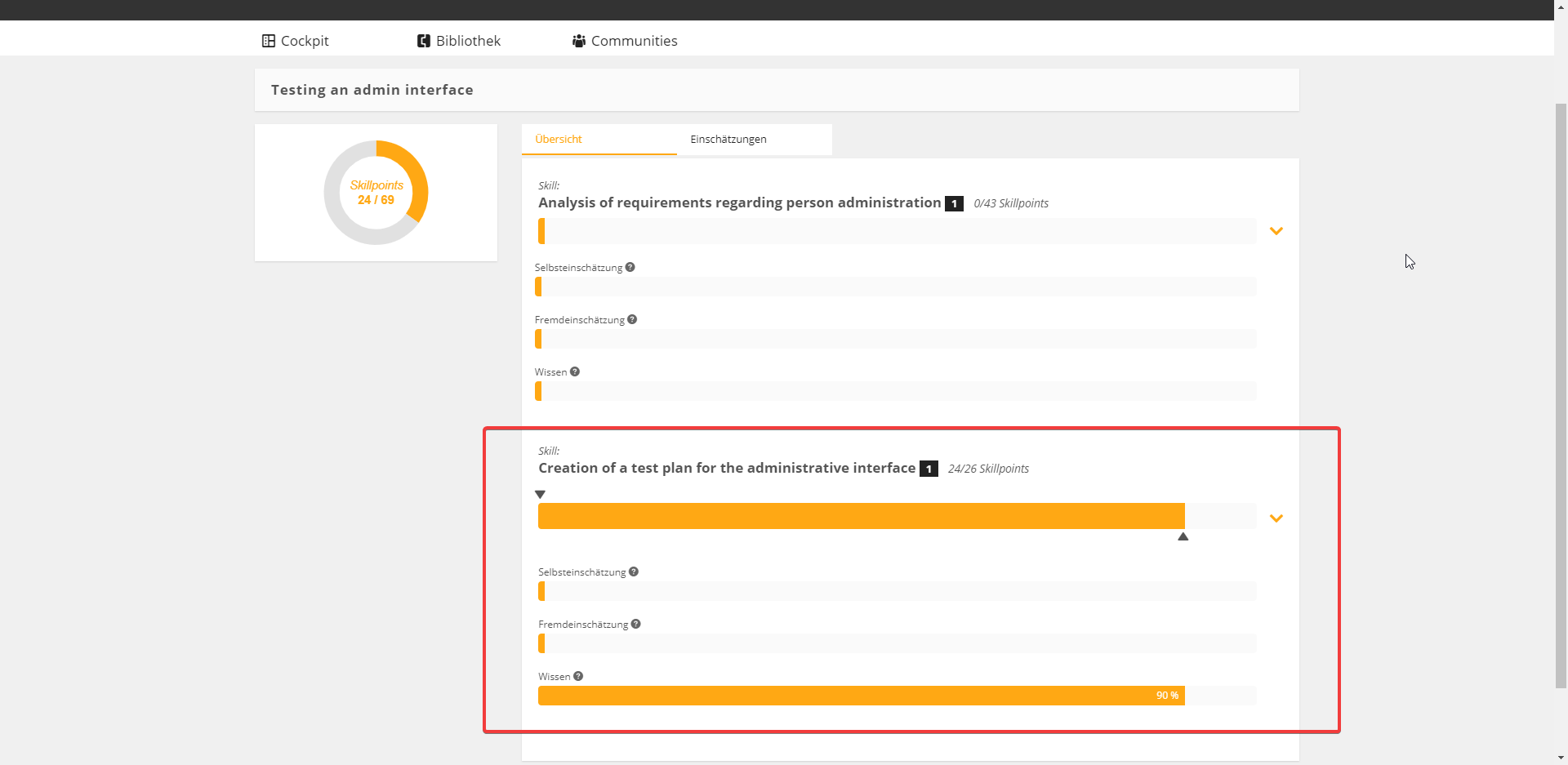 Betrachten wir nun weiter die Skillpoints. Ohne eine Selbst- oder Fremdeinschätzung ist der einzige Wert, der für die Skillpoints berücksichtigt wird, derjenige, der im "Wissen", also im Kurs erreicht wurde. Für diesen Skill, der mit 26 maximalen Skillpoints berechnet wurde, entsprechen 90% 24 Skillpoints.