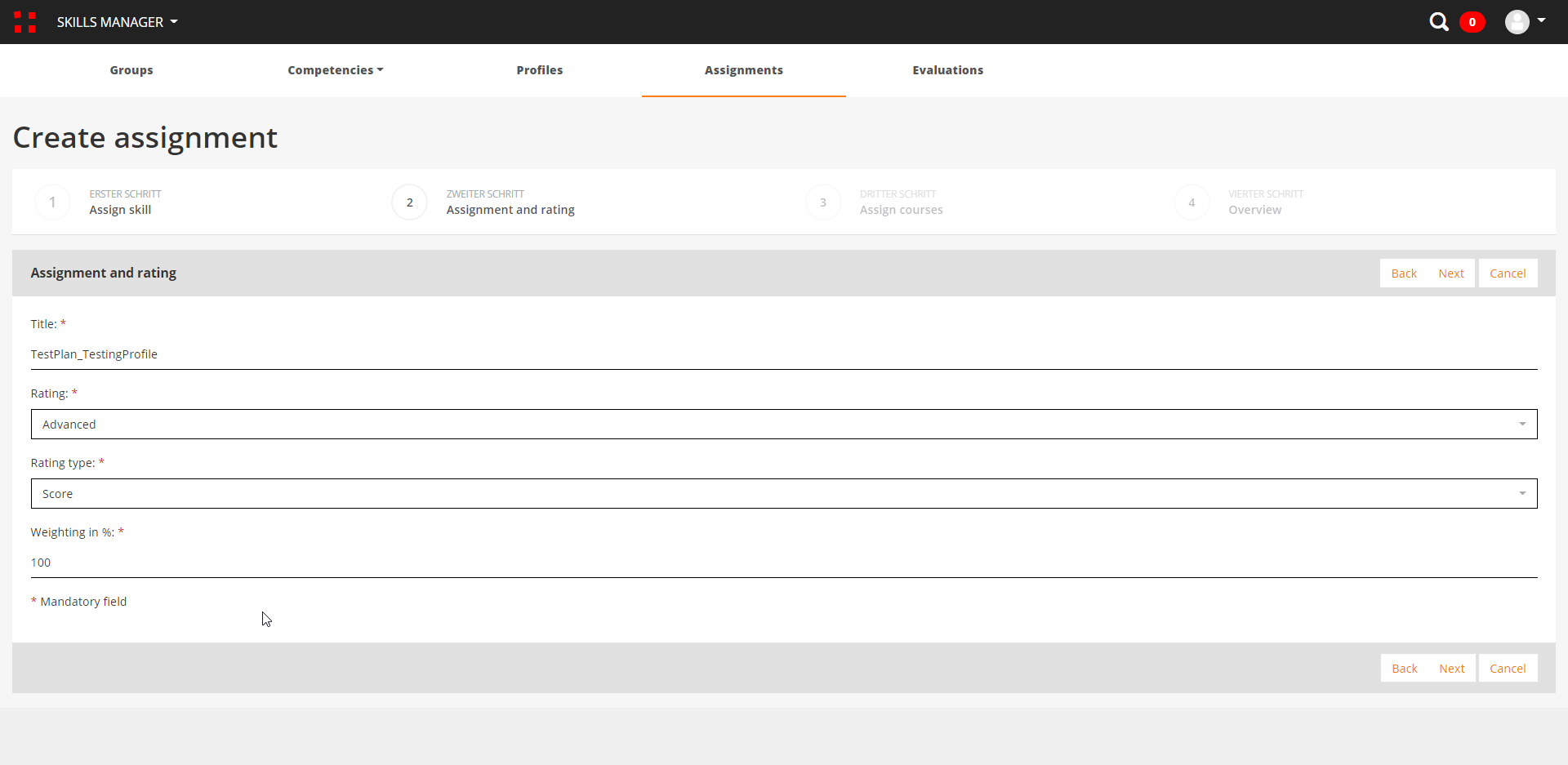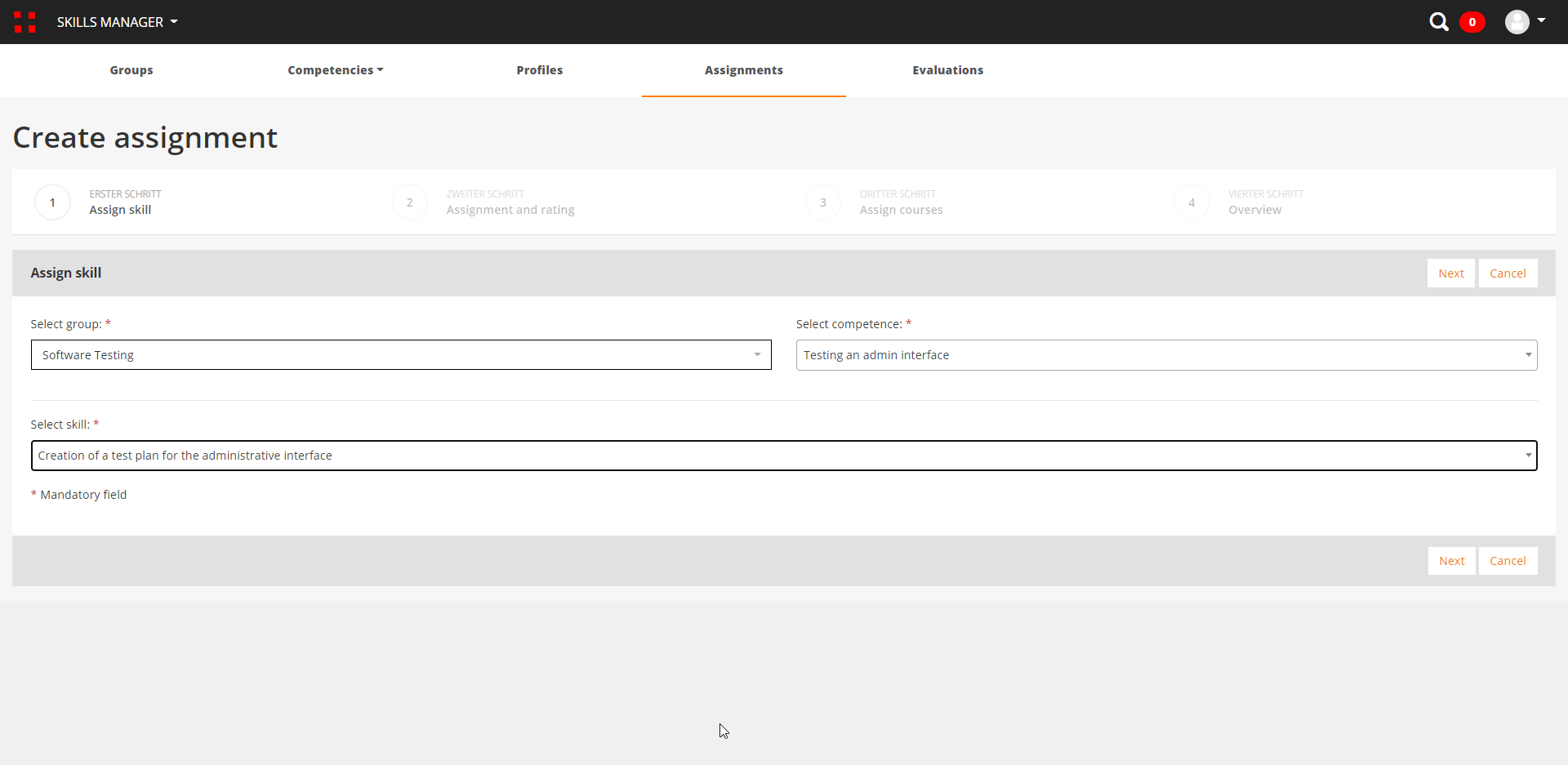 Wählen Sie die Kompetenzgruppe, die Kompetenz und den Skill, den Sie mit einem Kurs verbinden möchten.