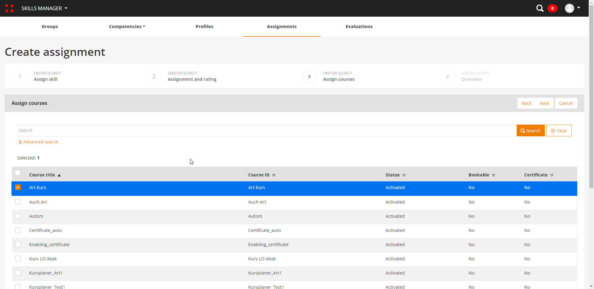 Wenn Sie zu diesem Schritt im Wizzard gelangen, sehen Sie alle Kurse der Kursverwaltung aufgelistet. Sie können Ihre Suche verfeinern und einen oder mehrere Kurse dem Skill zuordnen.