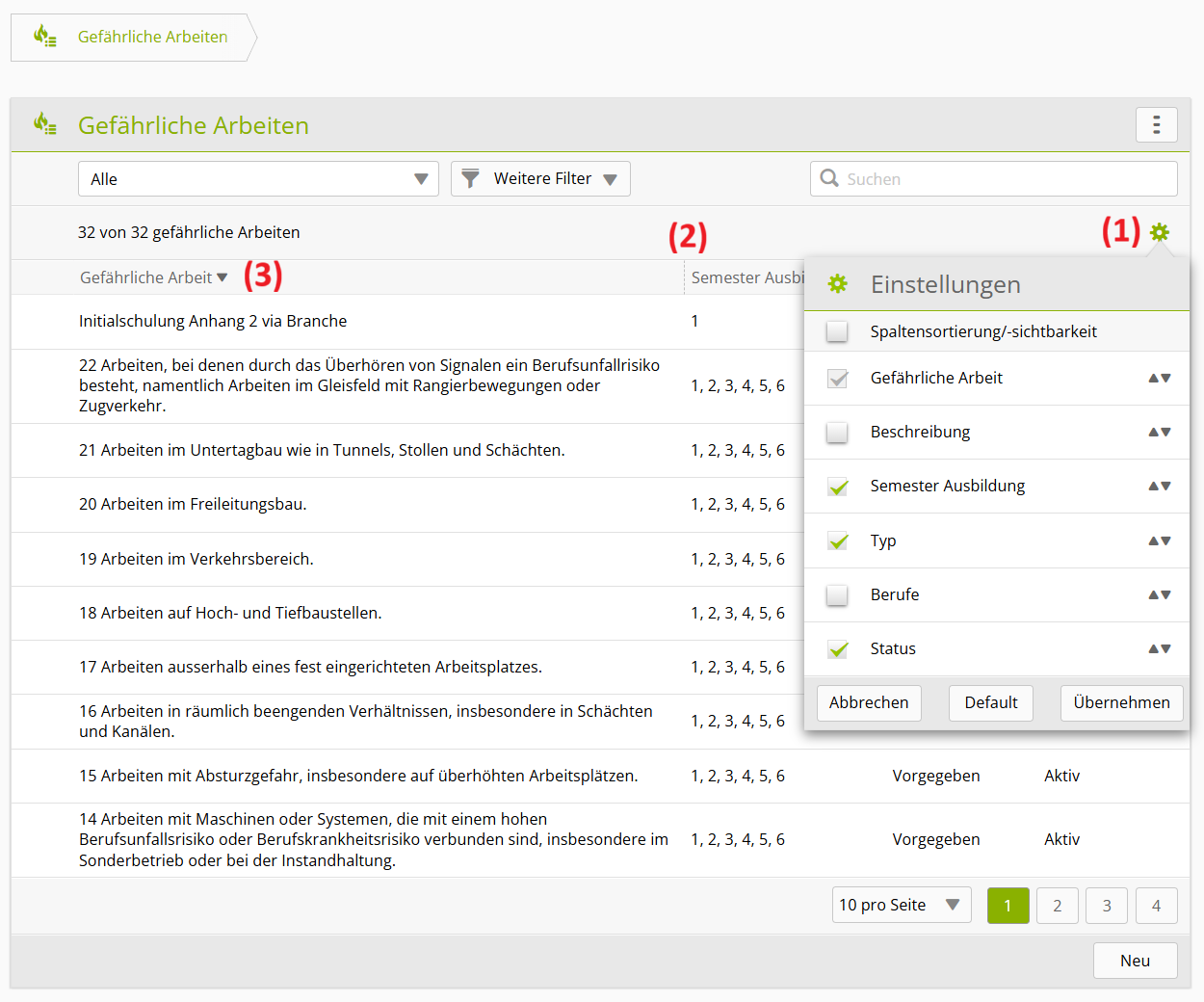 Die Listen in time2learn geben schnell und einfach eine Übersicht der Daten. Die gemachten Einstellungen werden für deinen Benutzer und pro Liste gespeichert.