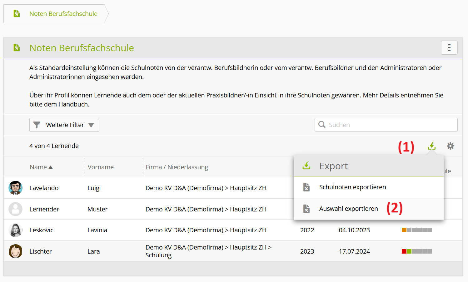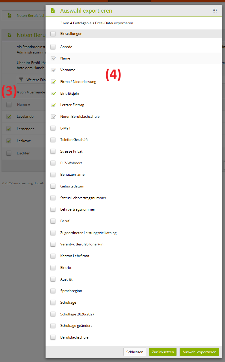 Bei jeder Auflistung befindet sich oben rechts der Export-Button (1). Mit "Auswahl exportieren" (2) können die Inhalte der Liste als Excel heruntergeladen werden: Hier kann sowohl der Umfang (3) als auch der Inhalt (4) gewählt werden. Zudem sind je nach Art der Information spezielle Exports verfügbar (z.B. Grafische Einsatzplanung oder Schulnoten).