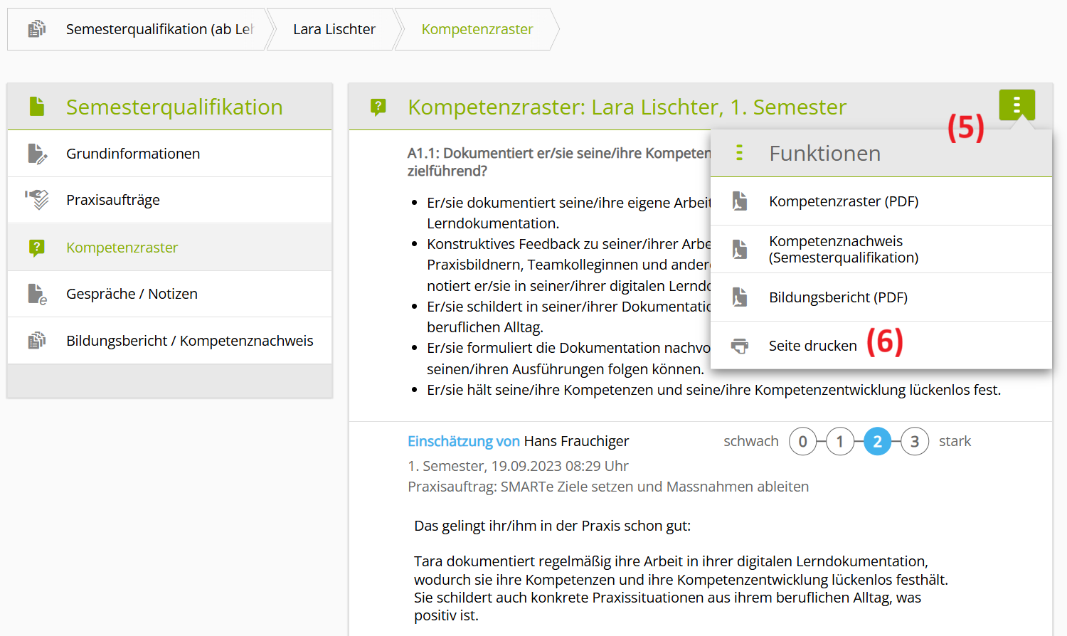 Auf Detailansichten sind die Reports oben rechts im Kontextmenu (5) zu finden. Offizielle Dokumente wie zum Beispiel der Bildungsbericht sind mit einem "Unterschriftsbereich" versehen um diese zu visieren und physisch abzulegen. Jede Seite kann mit 'Seite drucken' (6) gut lesbar auf einen Drucker oder als PDF-Datei ausgegeben werden.