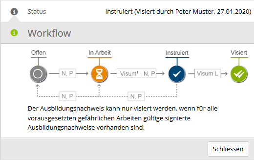 Bildungsberichte, Ausbildungsnachweise oder ALS und PE durchlaufen einen Prozess. Zum Beispiel erstellt die Berufsbildnerin einen Ausbildungsnachweis für eine Gefährliche Arbeit und visiert diesen nach erfolgter Instruktion. Anschliessend wird der Lernende mit einem Visum den Erhalt der Ausbildung bestätigen. Der Nachweis kann nun nicht mehr verändert werden.