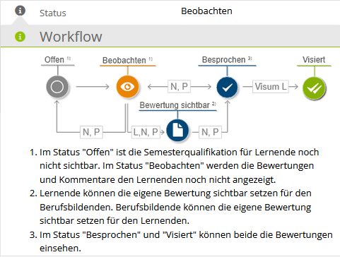 time2learn bietet die Möglichkeit, schon während dem Semester am Bildungsbericht oder dem Kompetenznachweis zu arbeiten: Dank dem integrierten Workflow und dem Status ‘Beobachten’ werden die Eingaben (Bewertungen und Kommentare) nicht den Lernenden angezeigt.