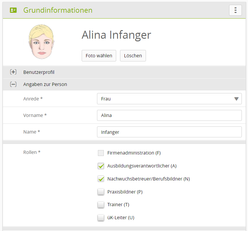 - Ausbildungsverantwortung und Berufsbildner/in (AN) – Durch die A-Rolle Einblick bei allen Lernenden und mit der N-Rolle als Berufsbildern im Profil auswählbar.
